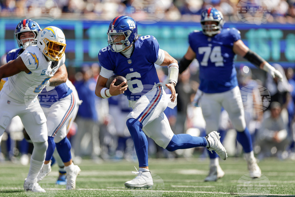 New York Giants quarterback Jaxson Dart (6) carries the ball against the Los Angeles Chargers during the first quarter of an NFL football game, Sunday, Sept. 28, 2025, in East Rutherford, N.J. (AP Photo/Adam Hunger)