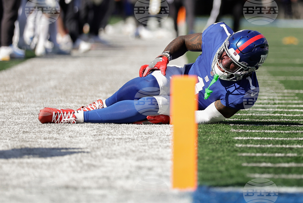New York Giants wide receiver Malik Nabers (1) reacts to an injury during the second quarter of an NFL football game against the Los Angeles Chargers, Sunday, Sept. 28, 2025, in East Rutherford, N.J. (AP Photo/Adam Hunger)