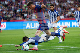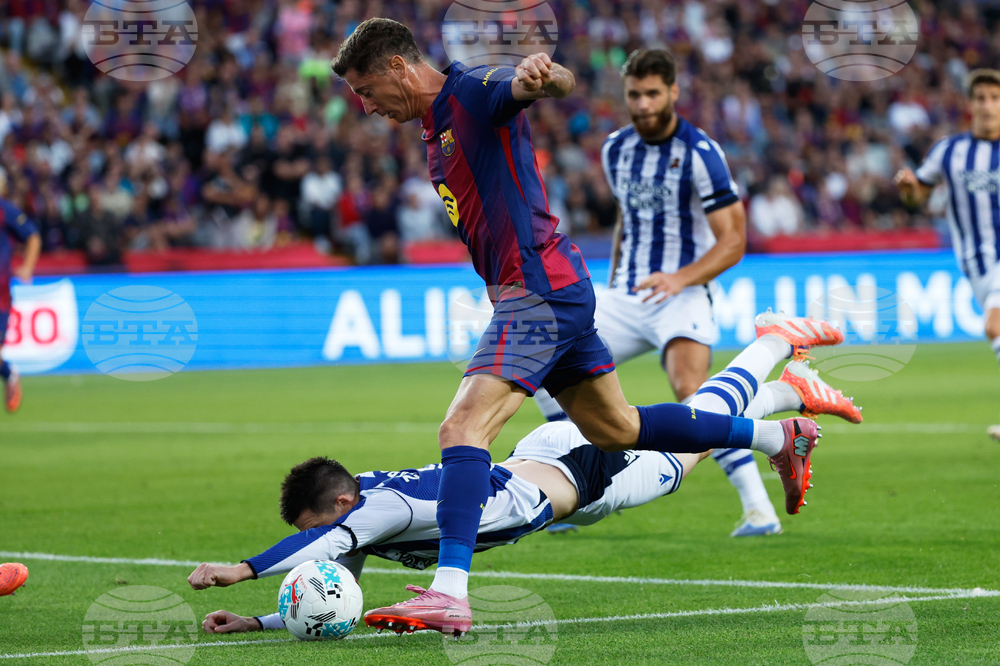 Real Sociedad's Igor Zubeldia, bottom, tries to block a shot by Barcelona's Robert Lewandowski during a Spanish La Liga soccer match between FC Barcelona and Real Sociedad at the Lluis Companys Olympic Stadium in Barcelona, Spain, Sunday, Sept. 28, 2025. (AP Photo/Joan Monfort)