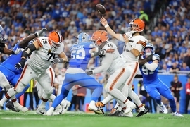 Cleveland Browns quarterback Joe Flacco (15) is pressured by Detroit Lions defensive end Aidan Hutchinson (97) during the second half of an NFL football game, Sunday, Sept. 28, 2025, in Detroit. (AP Photo/Rey Del Rio)