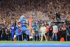 Detroit Lions wide receiver Amon-Ra St. Brown (14) goes in for a touchdown during the first half of an NFL football game against the Cleveland Browns, Sunday, Sept. 28, 2025, in Detroit. (AP Photo/Paul Sancya)