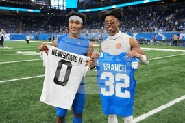 Detroit Lions safety Brian Branch, left, and Cleveland Browns' Greg Newsome II pose following an NFL football game, Sunday, Sept. 28, 2025, in Detroit. (AP Photo/Paul Sancya)