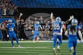 Detroit Lions cornerback DJ. Reed (4) reacts after an interception during the first half of an NFL football game against the Cleveland Browns, Sunday, Sept. 28, 2025, in Detroit. (AP Photo/Rey Del Rio)