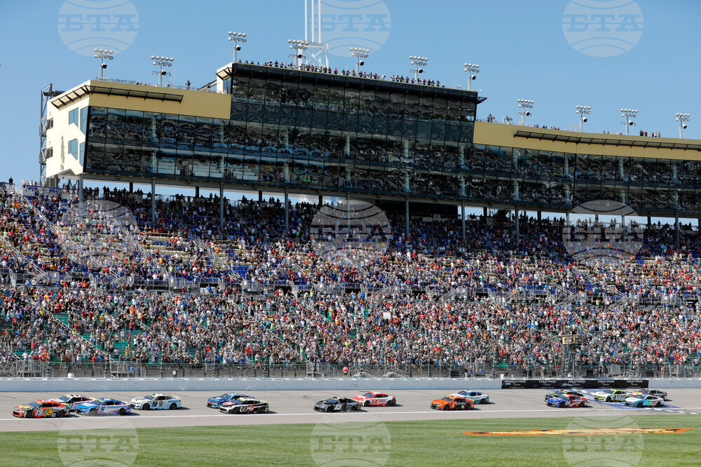 Drivers head down the front straightaway during a NASCAR Cup Series auto race at Kansas Speedway in Kansas City, Kan., Sunday, Sept. 28, 2025. (AP Photo/Colin E. Braley)