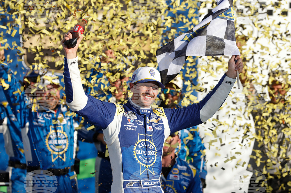 Chase Elliott celebrates after winning a NASCAR Cup Series auto race at Kansas Speedway in Kansas City, Kan., Sunday, Sept. 28, 2025. (AP Photo/Colin E. Braley)