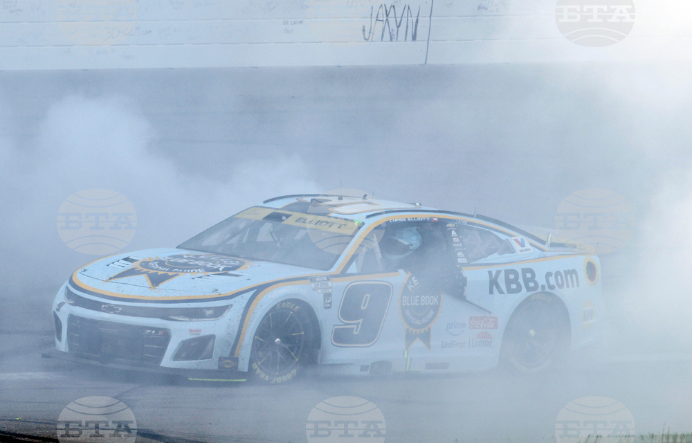 Chase Elliott does a burnout after winning a NASCAR Cup Series auto race at Kansas Speedway in Kansas City, Kan., Sunday, Sept. 28, 2025. (AP Photo/Colin E. Braley)