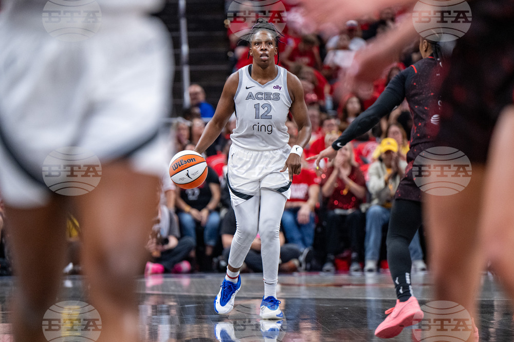 Las Vegas Aces guard Chelsea Gray (12) brings the ball upcourt during the first half of Game 4 of a WNBA basketball playoff semifinals series against the Indiana Fever in Indianapolis, Sunday, Sept. 28, 2025. (AP Photo/Doug McSchooler)
