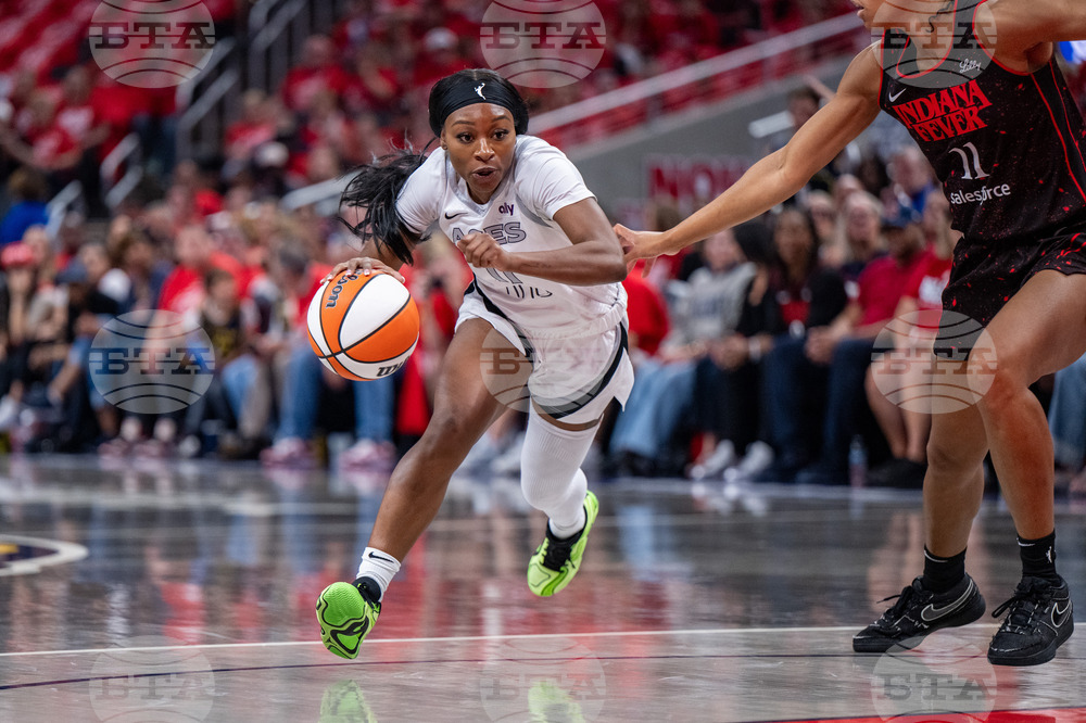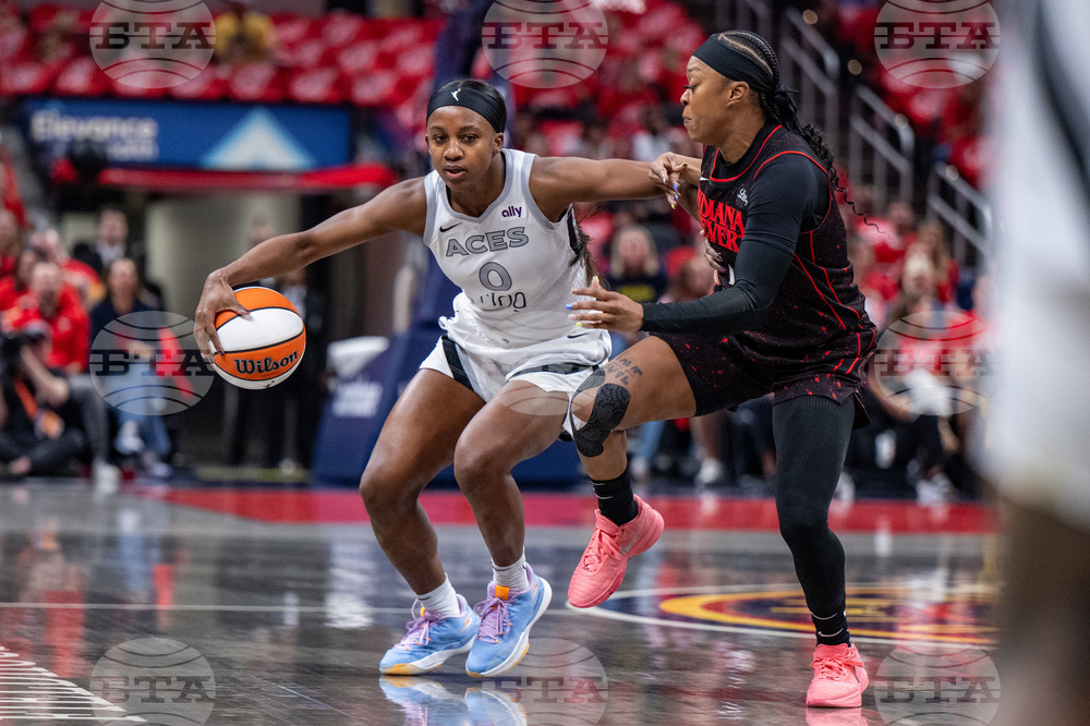 Las Vegas Aces guard Jackie Young (0) drives the ball around the defense of Indiana Fever guard Odyssey Sims, right, during the first half of Game 4 of a WNBA basketball playoff semifinals series in Indianapolis, Sunday, Sept. 28, 2025. (AP Photo/Doug McSchooler)