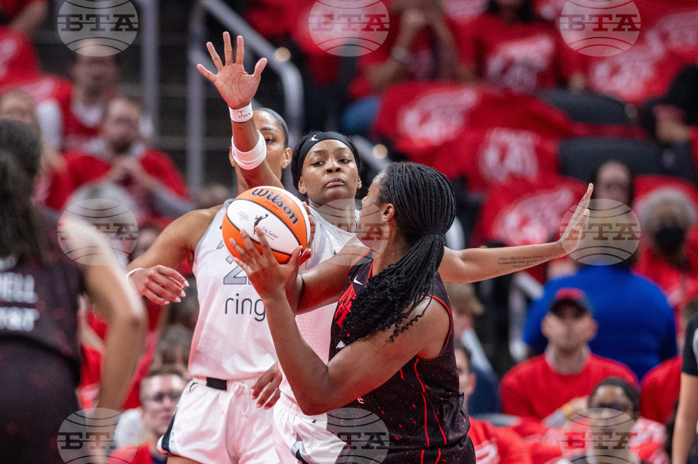 Las Vegas Aces center A'ja Wilson (22) dives for the ball while defended by Indiana Fever forward Brianna Turner, left, during the second half of Game 4 of a WNBA basketball playoff semifinals series in Indianapolis, Sunday, Sept. 28, 2025. (AP Photo/Doug McSchooler)
