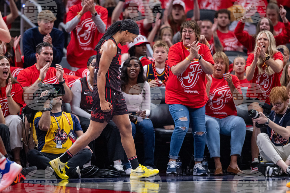 Indiana Fever forward Aliyah Boston (7) reacts after being fouled during the second half of Game 4 of a WNBA basketball playoff semifinals series against the Las Vegas Aces in Indianapolis, Sunday, Sept. 28, 2025. (AP Photo/Doug McSchooler)