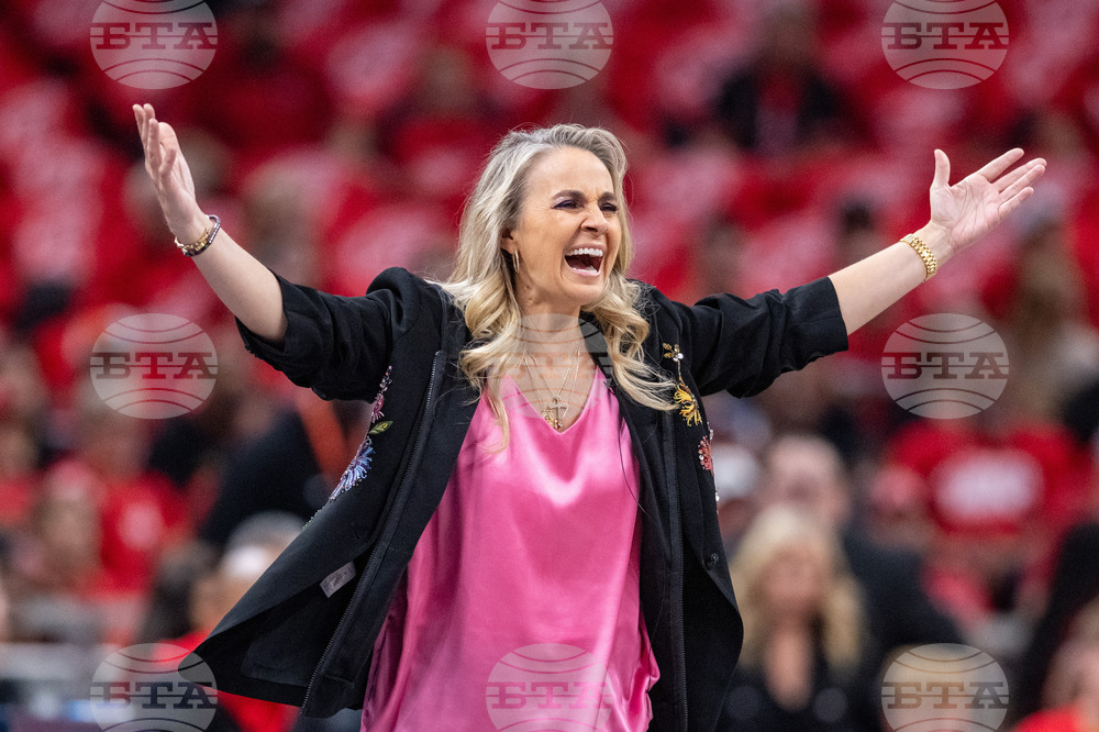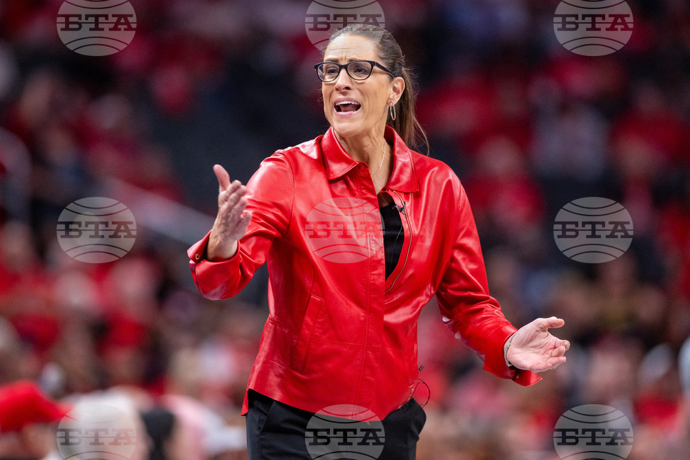 Las Vegas Aces head coach Becky Hammon reacts during the first half of Game 4 of a WNBA basketball playoff semifinals series against the Indiana Fever in Indianapolis, Sunday, Sept. 28, 2025. (AP Photo/Doug McSchooler)