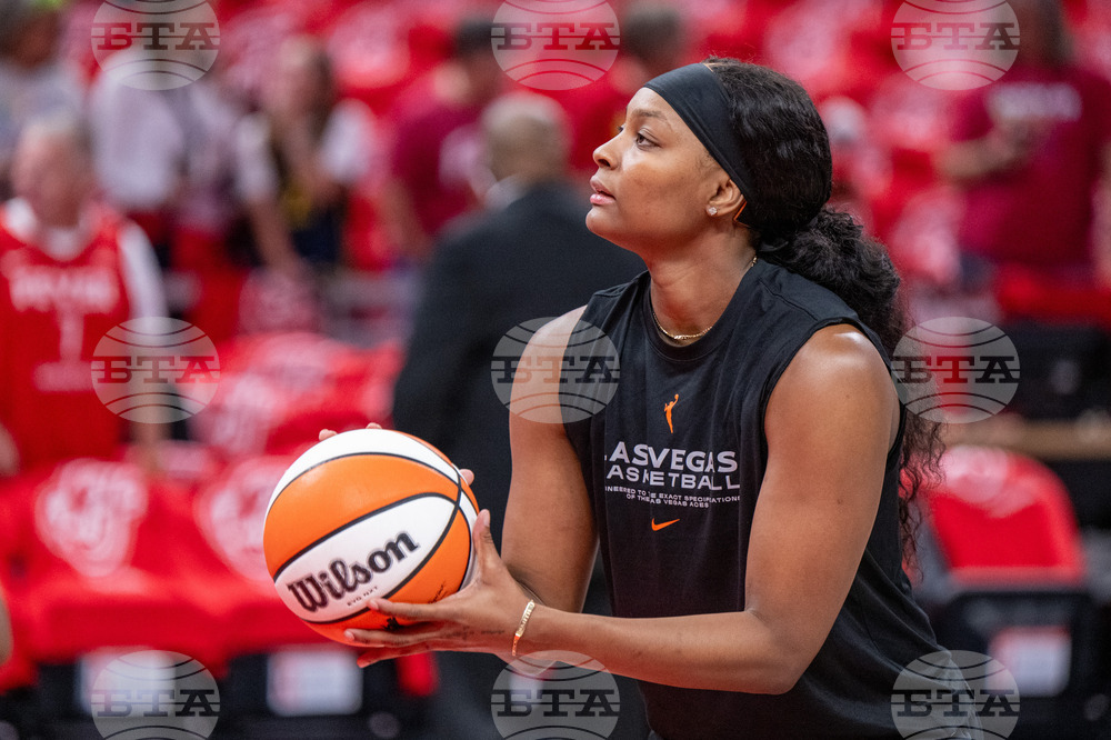 Las Vegas Aces forward NaLyssa Smith (3) warms up on the court before Game 4 of a WNBA basketball playoff semifinals series against the Indiana Fever in Indianapolis, Sunday, Sept. 28, 2025. (AP Photo/Doug McSchooler)