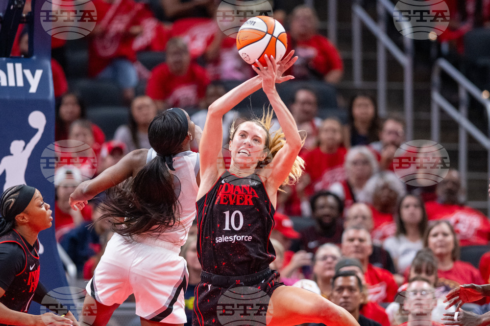 Indiana Fever guard Lexie Hull (10) reaches for a rebound during the second half of Game 4 of a WNBA basketball playoff semifinals series against the Las Vegas Aces in Indianapolis, Sunday, Sept. 28, 2025. (AP Photo/Doug McSchooler)