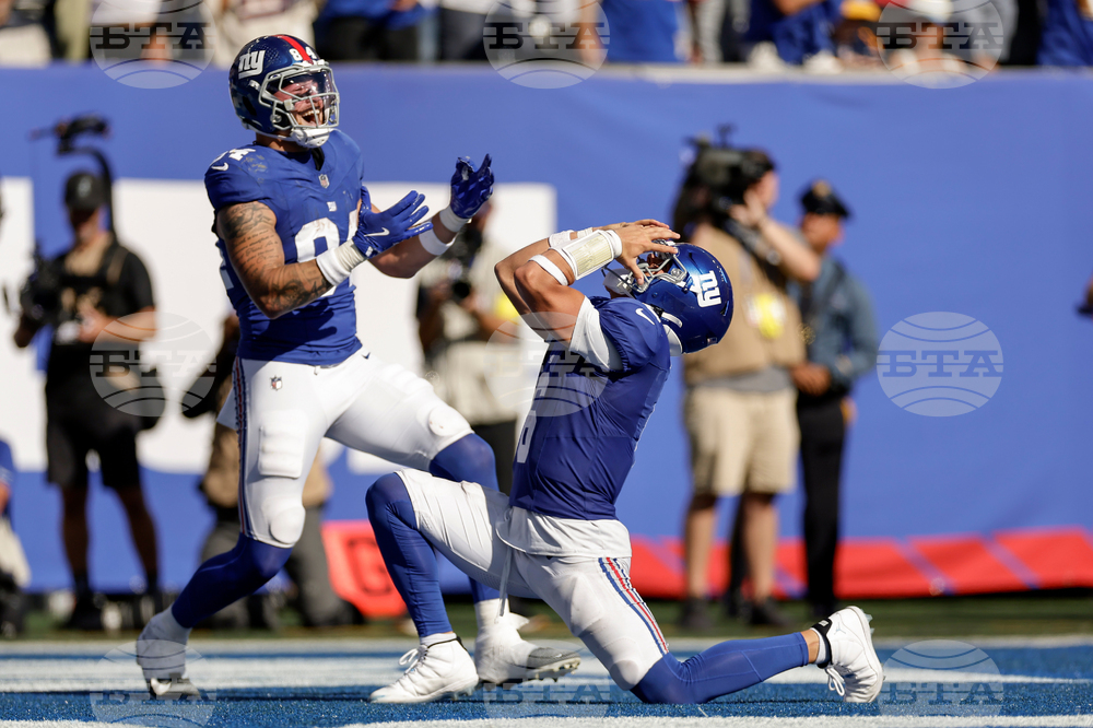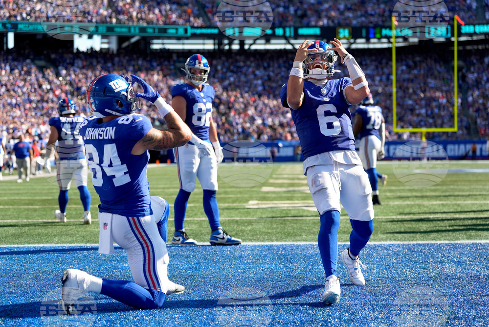 New York Giants tight end Theo Johnson (84) and quarterback Jaxson Dart (6) celebrate after Johnson scored a touchdown against the Los Angeles Chargers during the third quarter of an NFL football game, Sunday, Sept. 28, 2025, in East Rutherford, N.J. (AP Photo/Yuki Iwamura)