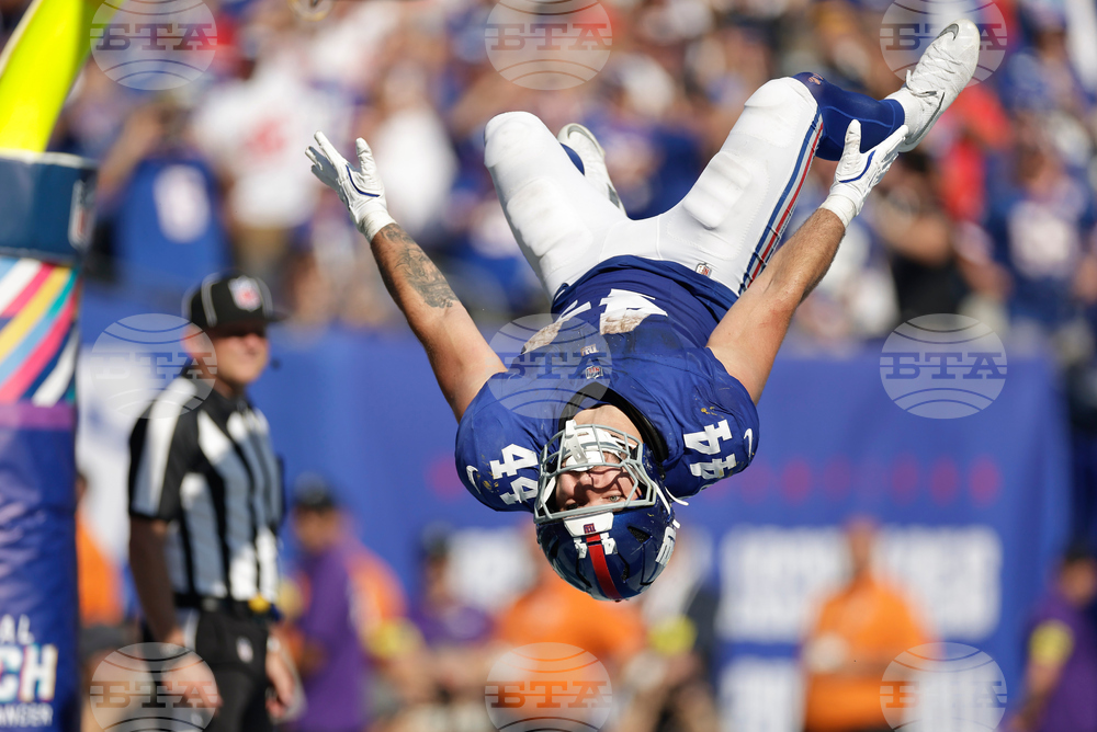 New York Giants running back Cam Skattebo (44) does a back flip after scoring on a two-point conversion against the Los Angeles Chargers during the third quarter of an NFL football game, Sunday, Sept. 28, 2025, in East Rutherford, N.J. (AP Photo/Adam Hunger)