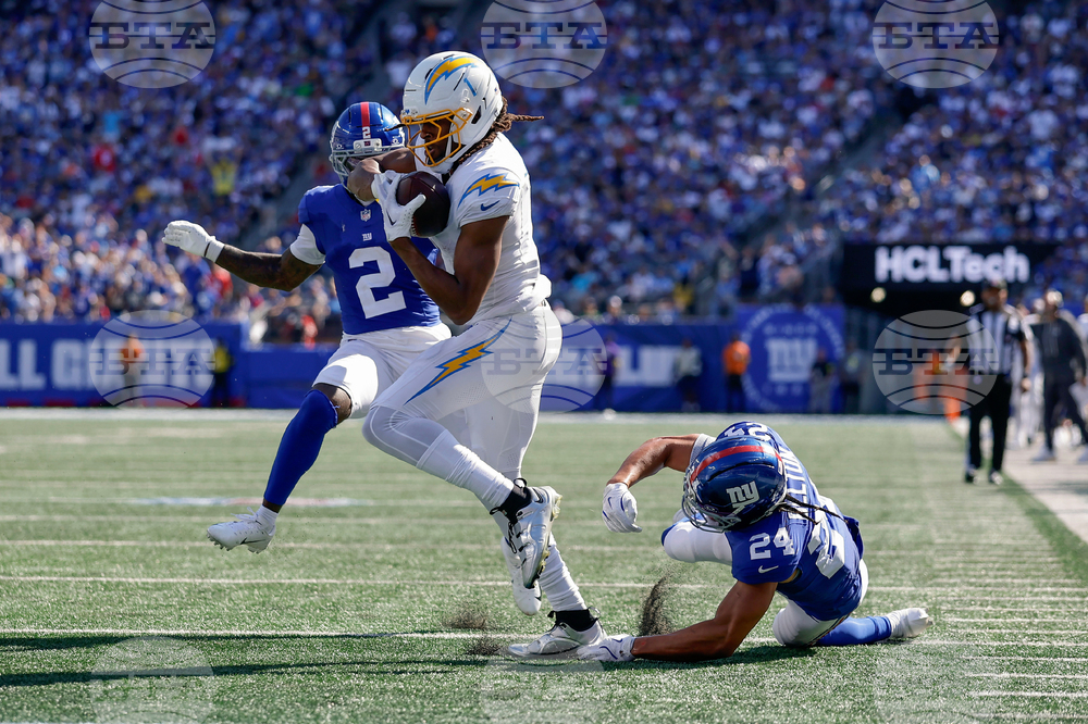 Los Angeles Chargers wide receiver Quentin Johnston (1) make a touchdown catch against New York Giants safety Dane Belton (24) and cornerback Deonte Banks (2) during the second quarter of an NFL football game, Sunday, Sept. 28, 2025, in East Rutherford, N.J. (AP Photo/Adam Hunger)