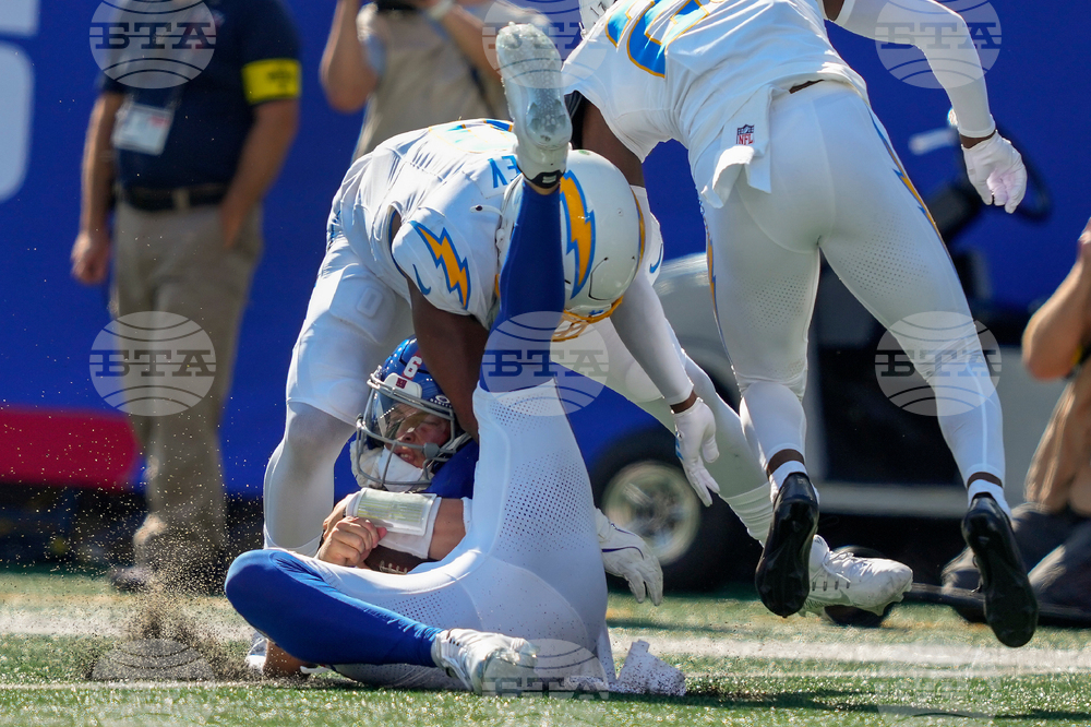 New York Giants quarterback Jaxson Dart (6) is tackled by Los Angeles Chargers cornerback Cam Hart (20) and linebacker Daiyan Henley (0) during the third quarter of an NFL football game, Sunday, Sept. 28, 2025, in East Rutherford, N.J. (AP Photo/Yuki Iwamura)
