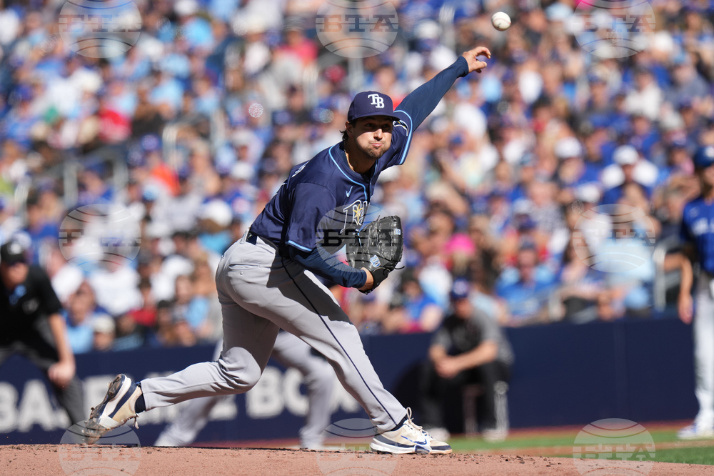 Tampa Bay Rays pitcher Ian Seymour throws against the Toronto Blue Jays during first-inning baseball game action in Toronto, Sunday, Sept. 28, 2025. (Chris Young/The Canadian Press via AP)