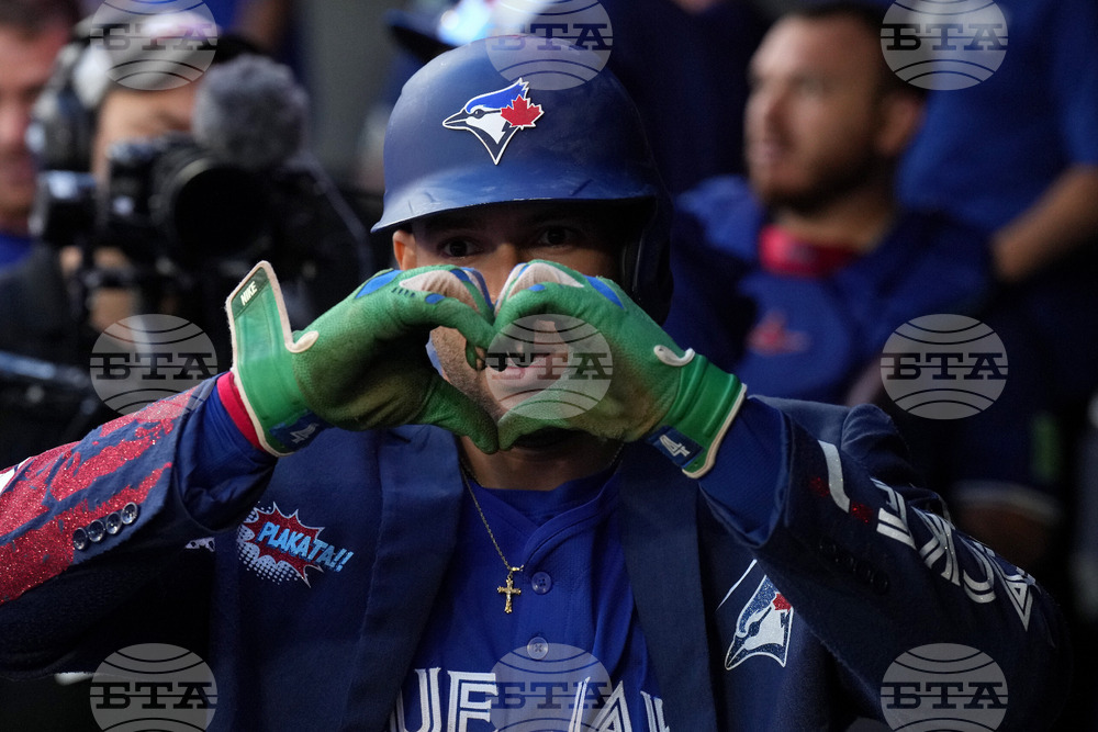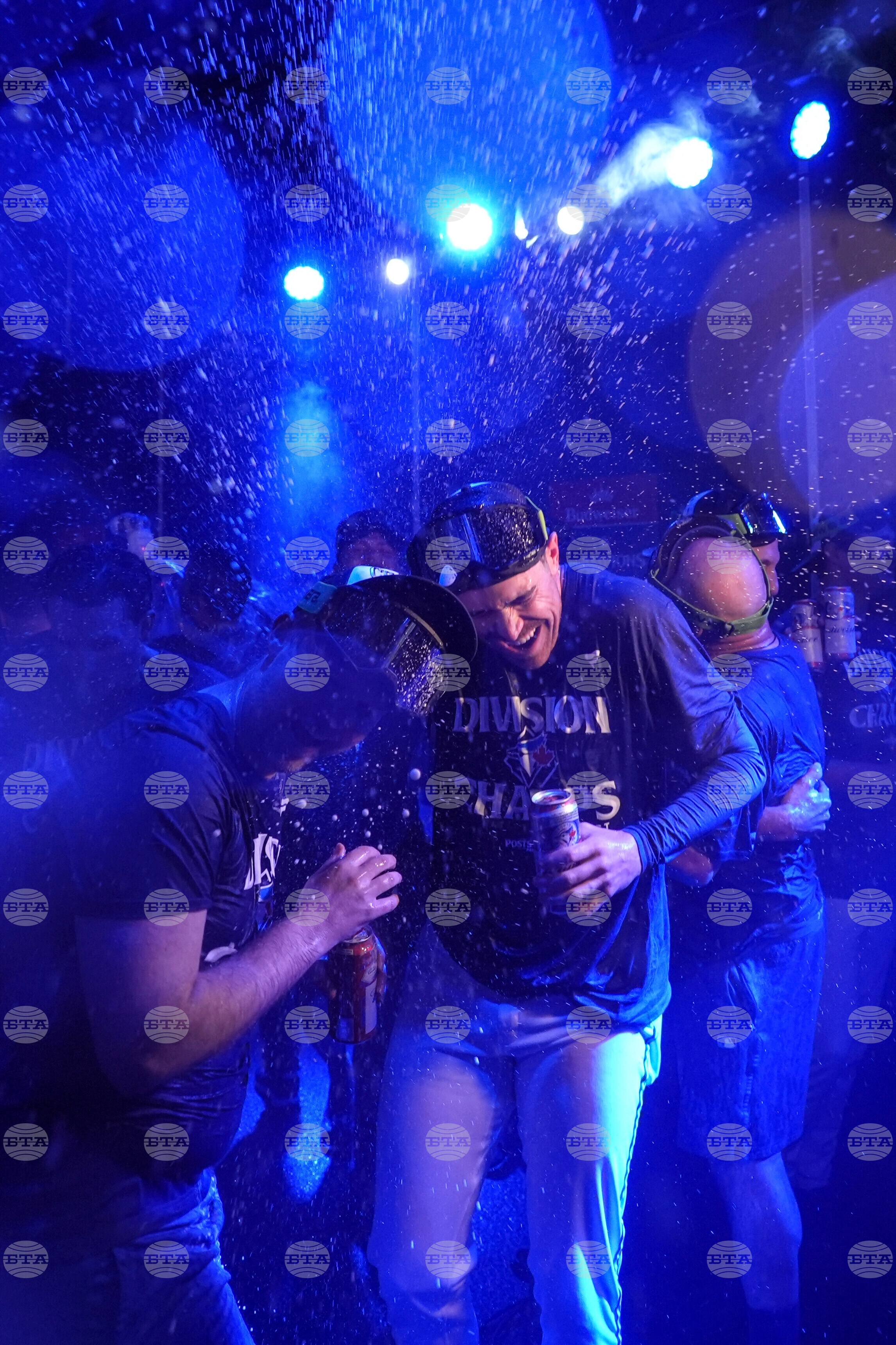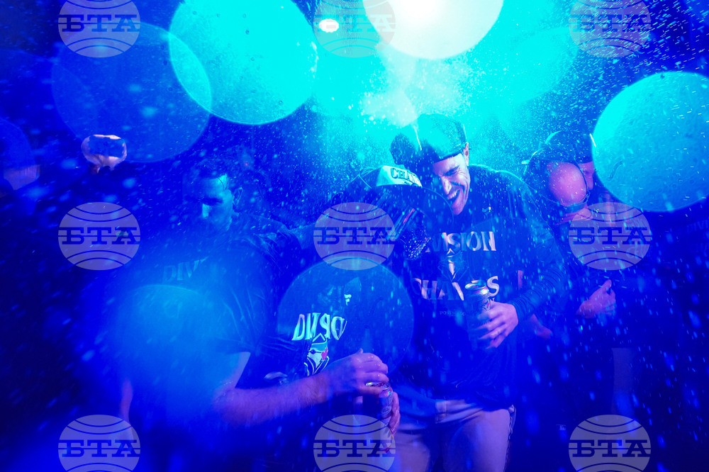 Toronto Blue Jays firstbaseman Vladimir Guerrero Jr. (right) George Springer join teammates as they celebrate winning the American League East Division title following MLB baseball action against the Tampa Bay Rays, in Toronto, Sunday, Sept. 28, 2025. (Chris Young/The Canadian Press via AP)