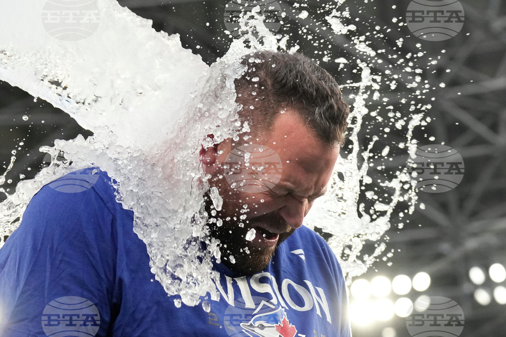 Toronto Blue Jays manager John Schneider is doused after his team's baseball game win over the Tampa Bay Rays secured the AL East Division title in Toronto, Sunday, Sept. 28, 2025. (Chris Young/The Canadian Press via AP)
