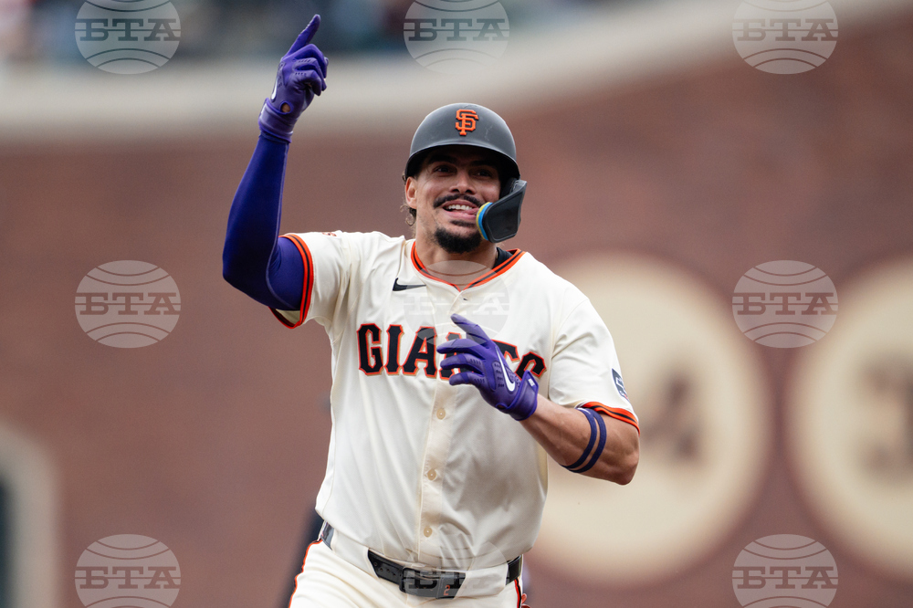 San Francisco Giants' Willy Adames rounds the bases after hitting a solo home run during the first inning of a baseball game against the Colorado Rockies, Sunday, Sept. 28, 2025, in San Francisco. (AP Photo/Thien-An Truong)