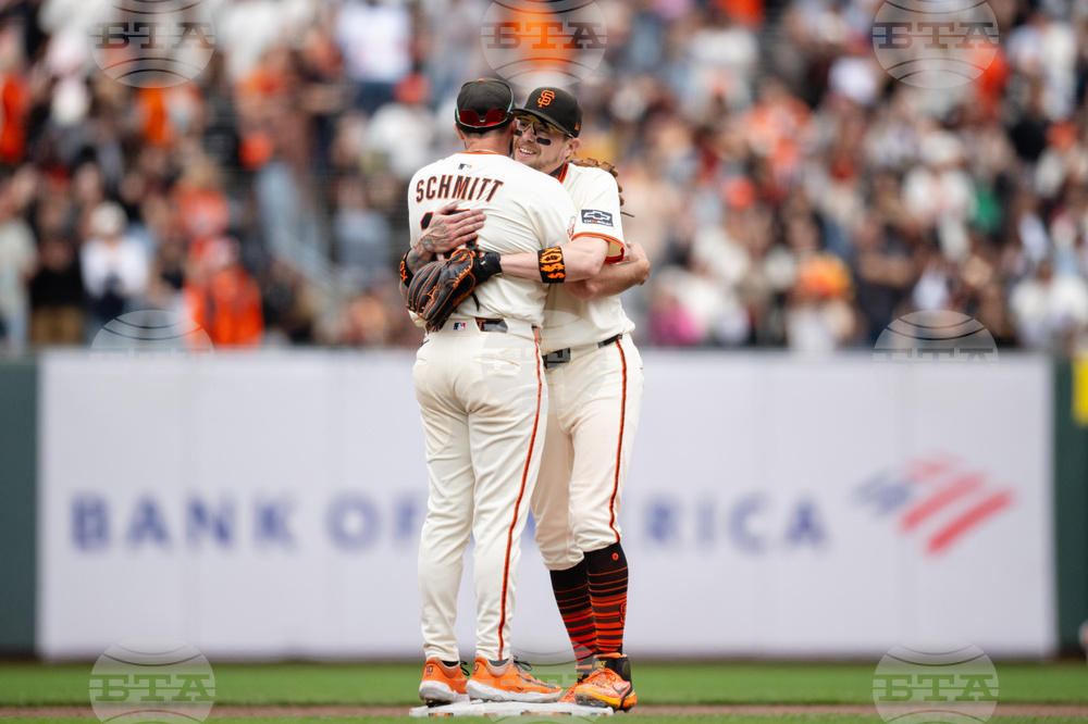 San Francisco Giants' Casey Schmitt, left, and second baseman Christian Koss, right, react after defeating the Colorado Rockies in a baseball game Sunday, Sept. 28, 2025, in San Francisco. (AP Photo/Thien-An Truong)