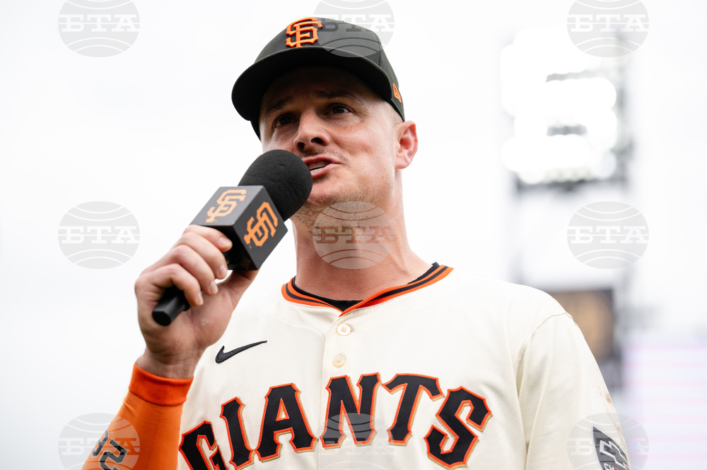 San Francisco Giants' Matt Chapman speaks to fans after a baseball game against the Colorado Rockies, Sunday, Sept. 28, 2025, in San Francisco. (AP Photo/Thien-An Truong)