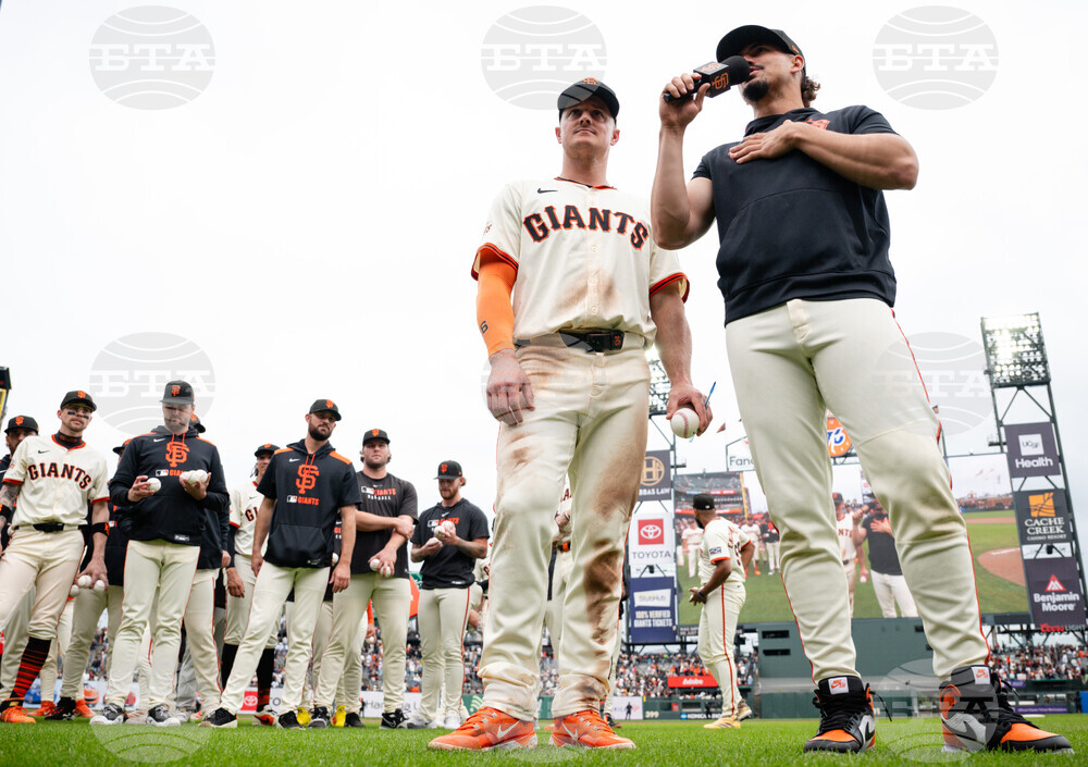 San Francisco Giants players react after a baseball game against the Colorado Rockies, Sunday, Sept. 28, 2025, in San Francisco. (AP Photo/Thien-An Truong)
