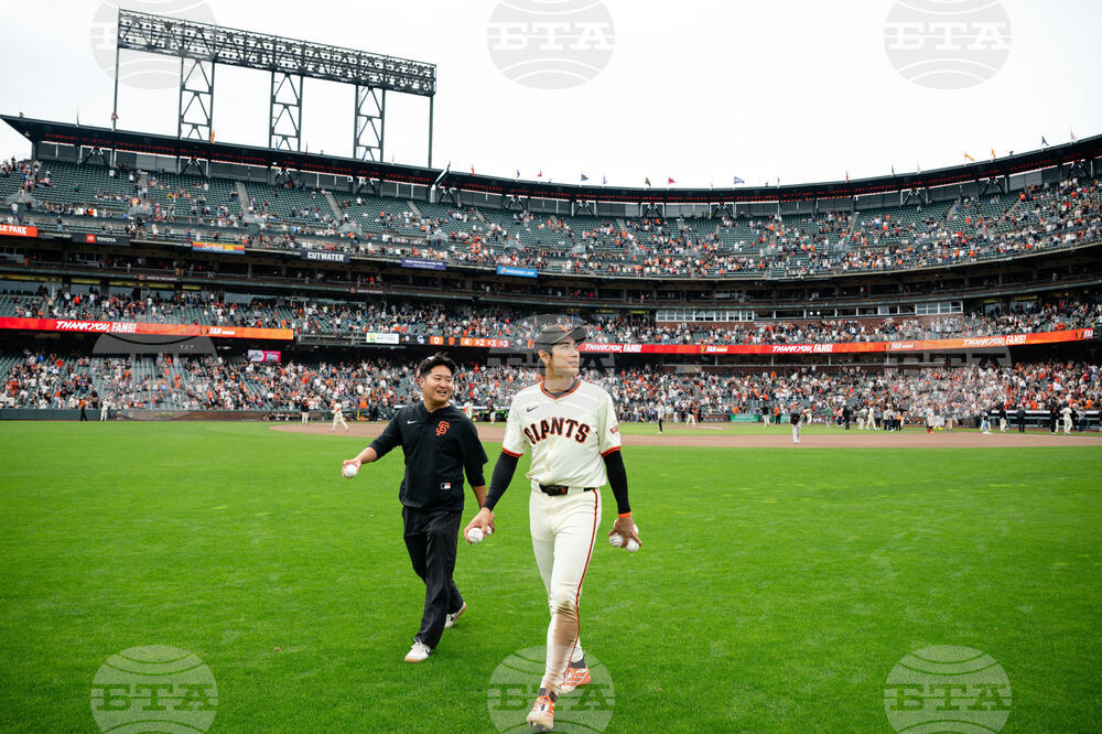 San Francisco Giants' Jung Hoo Lee, right, throws baseballs to fans after a baseball game against the Colorado Rockies, Sunday, Sept. 28, 2025, in San Francisco. (AP Photo/Thien-An Truong)