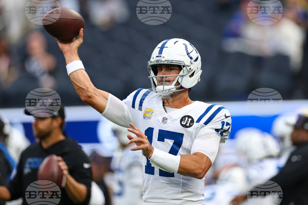 Indianapolis Colts quarterback Daniel Jones (17) throws before an NFL football game against the Los Angeles Rams Sunday, Sept. 28, 2025, in Inglewood, Calif. (AP Photo/Eric Thayer)