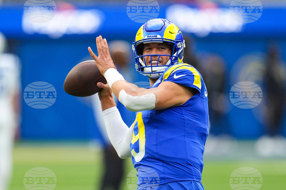 Los Angeles Rams quarterback Matthew Stafford (9) throws before an NFL football game against the Indianapolis Colts Sunday, Sept. 28, 2025, in Inglewood, Calif. (AP Photo/Marcio Jose Sanchez)