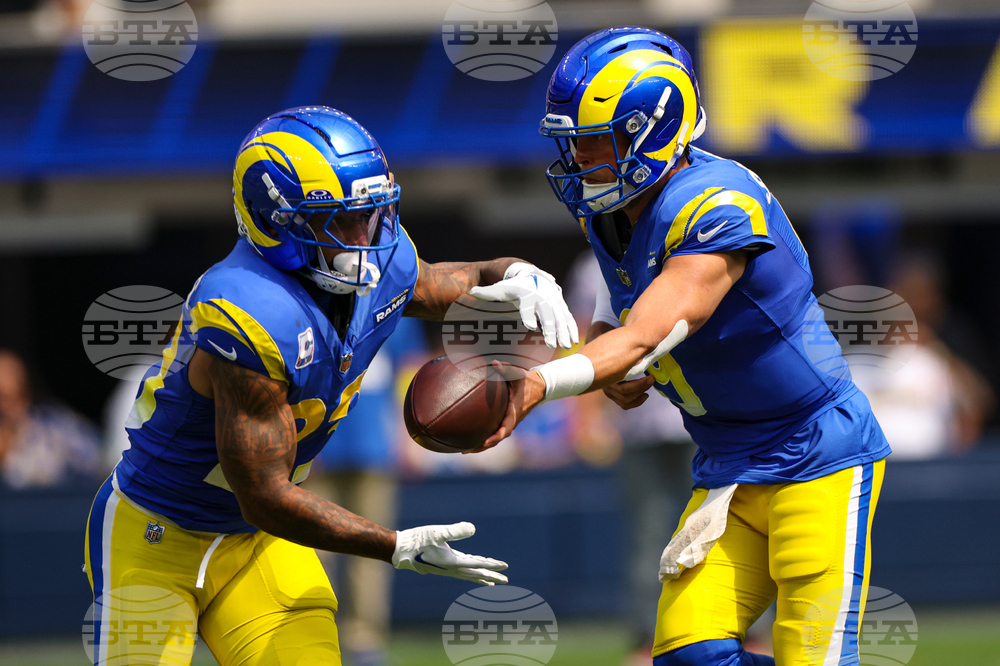 Los Angeles Rams quarterback Matthew Stafford (9) hands off to running back Kyren Williams (23) during the first hall of an NFL football game against the Indianapolis Colts Sunday, Sept. 28, 2025, in Inglewood, Calif. (AP Photo/Eric Thayer)