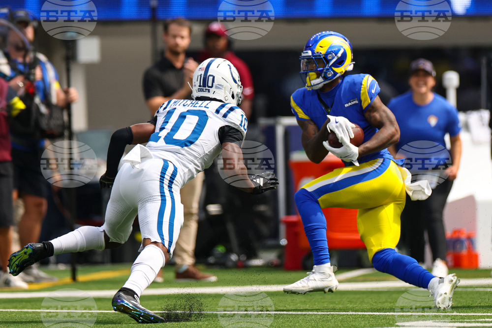 Los Angeles Rams wide receiver Tutu Atwell (5) runs for a touchdown after a catch against the Indianapolis Colts during the second hall of an NFL football game Sunday, Sept. 28, 2025, in Inglewood, Calif. (AP Photo/Marcio Jose Sanchez)