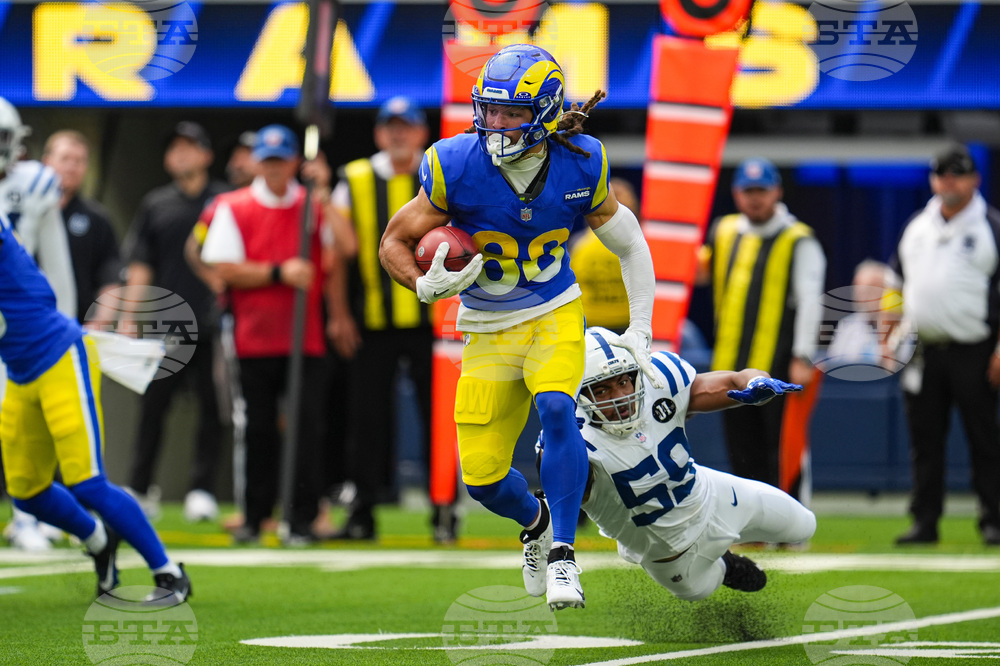 Los Angeles Rams running back Kyren Williams (23) is tackled by Indianapolis Colts linebacker Joe Bachie (48) during the first hall of an NFL football game Sunday, Sept. 28, 2025, in Inglewood, Calif. (AP Photo/Marcio Jose Sanchez)