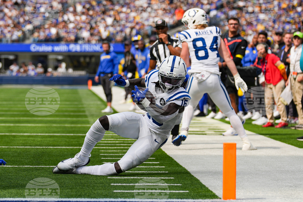 Indianapolis Colts wide receiver Ashton Dulin (16) goes out-of-bounds after a catch against the Los Angeles Rams during the first hall of an NFL football game Sunday, Sept. 28, 2025, in Inglewood, Calif. (AP Photo/Marcio Jose Sanchez)