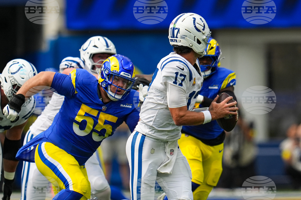 Indianapolis Colts quarterback Daniel Jones (17) is pressured by Los Angeles Rams defensive end Braden Fiske (55) during the first hall of an NFL football game Sunday, Sept. 28, 2025, in Inglewood, Calif. (AP Photo/Marcio Jose Sanchez)