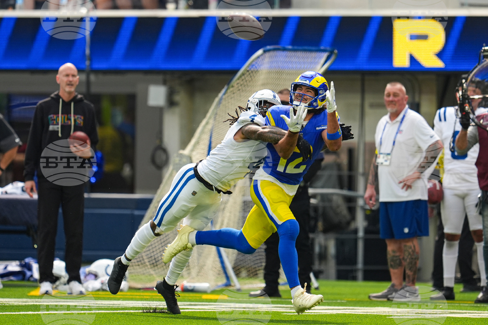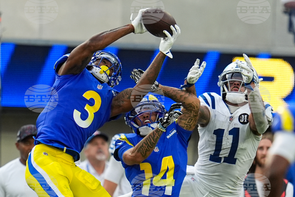 Los Angeles Rams safety Kam Curl (3) intercepts a pass in front of Indianapolis Colts wide receiver Adonai Mitchell (10) during the first hall of an NFL football game Sunday, Sept. 28, 2025, in Inglewood, Calif. (AP Photo/Eric Thayer)