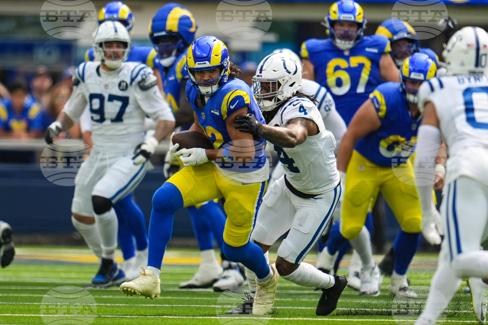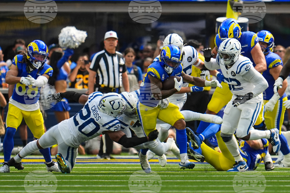 Los Angeles Rams running back Blake Corum (22) is tackled by Indianapolis Colts defensive tackle Deforest Buckner (99) during the first hall of an NFL football game Sunday, Sept. 28, 2025, in Inglewood, Calif. (AP Photo/Marcio Jose Sanchez)