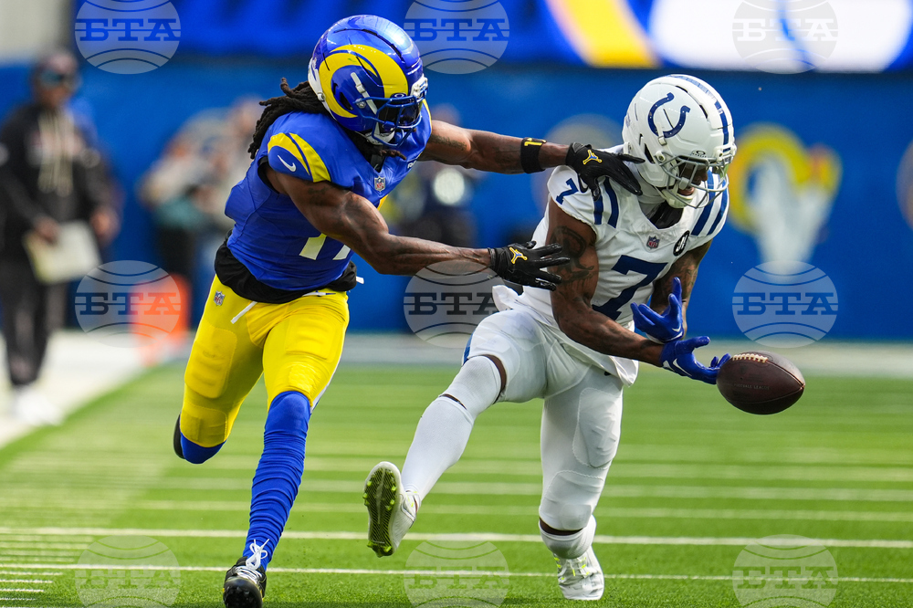 Indianapolis Colts cornerback Charvarius Ward (7) breaks up a pass to Los Angeles Rams wide receiver Davante Adams (17) during the second hall of an NFL football game Sunday, Sept. 28, 2025, in Inglewood, Calif. (AP Photo/Marcio Jose Sanchez)