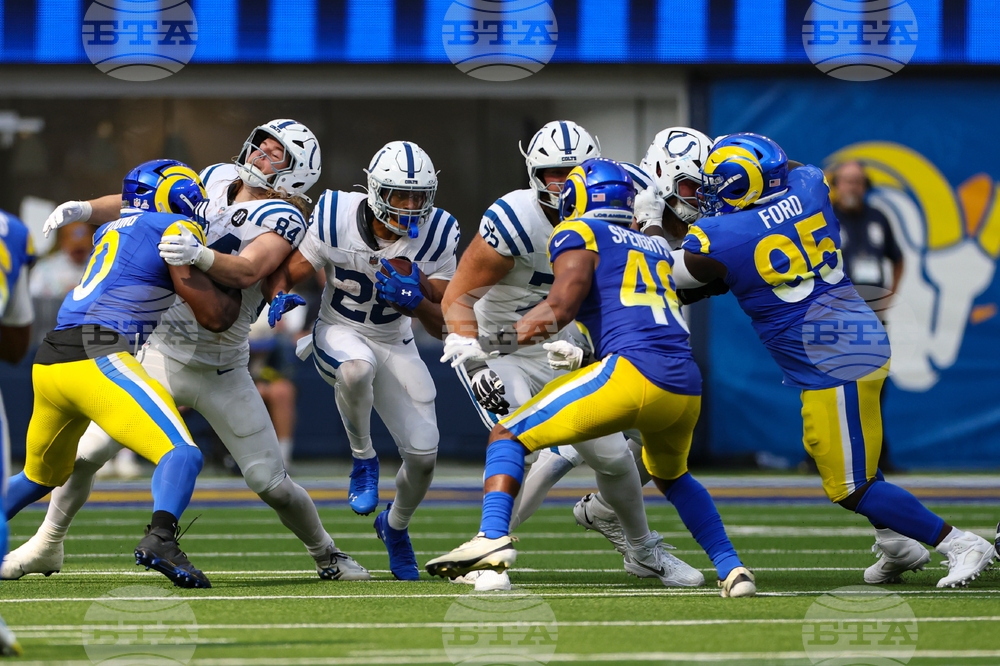 Indianapolis Colts running back Jonathan Taylor (28) is tackled by Los Angeles Rams linebacker Nate Landman (53) and safety Quentin Lake (37) during the second hall of an NFL football game Sunday, Sept. 28, 2025, in Inglewood, Calif. (AP Photo/Marcio Jose Sanchez)
