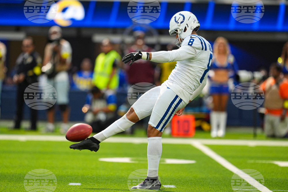 Indianapolis Colts punter Rigoberto Sanchez (8) punts against the Los Angeles Rams during the second hall of an NFL football game Sunday, Sept. 28, 2025, in Inglewood, Calif. (AP Photo/Marcio Jose Sanchez)