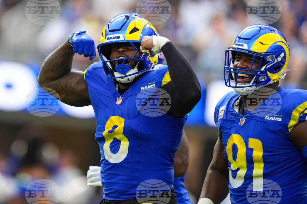 Los Angeles Rams safety Kam Curl (3) celebrates and interception with linebacker Nate Landman (53) as Indianapolis Colts safety Daniel Scott (32) looks on during the second hall of an NFL football game Sunday, Sept. 28, 2025, in Inglewood, Calif. (AP Photo/Marcio Jose Sanchez)