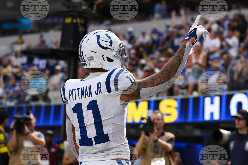 Indianapolis Colts wide receiver Michael Pittman (11) celebrates a touchdown against the Los Angeles Rams during the second hall of an NFL football game Sunday, Sept. 28, 2025, in Inglewood, Calif. (AP Photo/Eric Thayer)