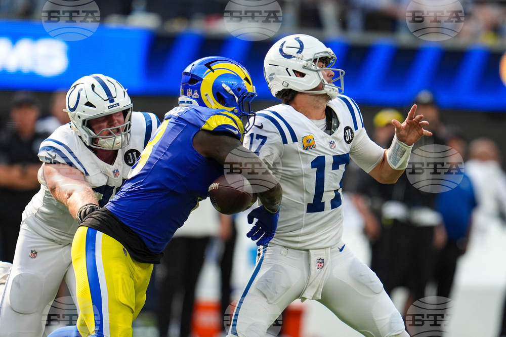 Indianapolis Colts defensive tackle Deforest Buckner (99) pressures Los Angeles Rams quarterback Matthew Stafford (9) during the first hall of an NFL football game Sunday, Sept. 28, 2025, in Inglewood, Calif. (AP Photo/Eric Thayer)