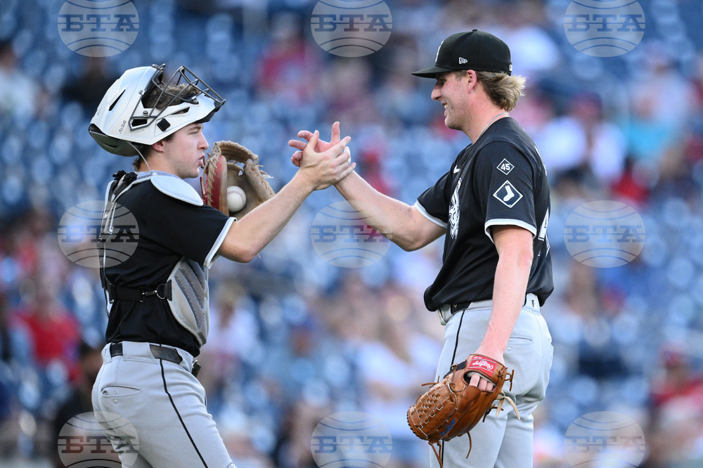 CORRECTS TO RELIEF PITCHER NOT STARTING PITCHER - Chicago White Sox relief pitcher Jonathan Cannon, right, and catcher Kyle Teel, left, celebrate after a baseball game against the Washington Nationals, Sunday, Sept. 28, 2025, in Washington. (AP Photo/Nick Wass)