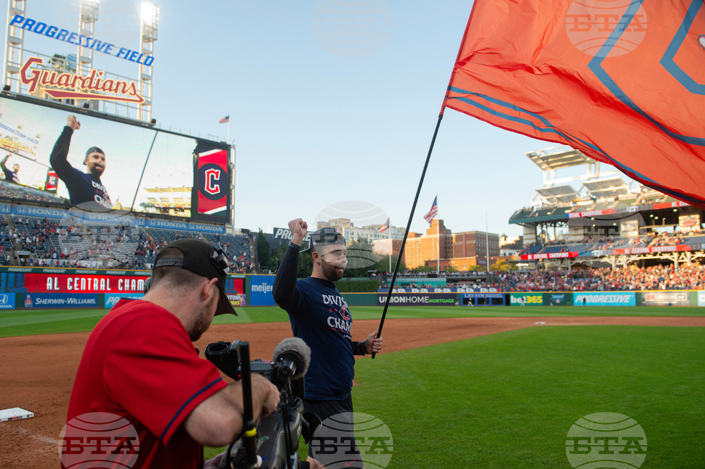 Cleveland Guardians' Jose Ramirez waves the American League Central Division championship flag as the team celebrates after a baseball game against the Texas Rangers, Sunday, Sept. 28, 2025, in Cleveland. (AP Photo/Phil Long)