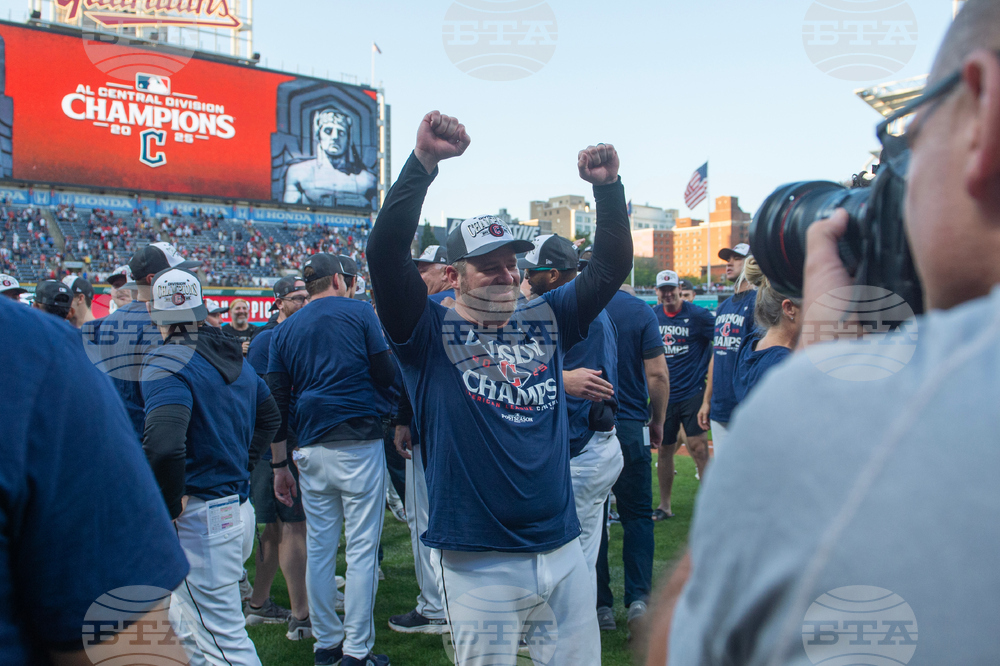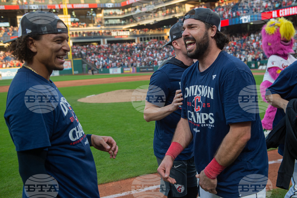 The Cleveland Guardians celebrate winning the American League Central Division Championship, Sept. 28, 2025, in Cleveland. (AP Photo/Phil Long)