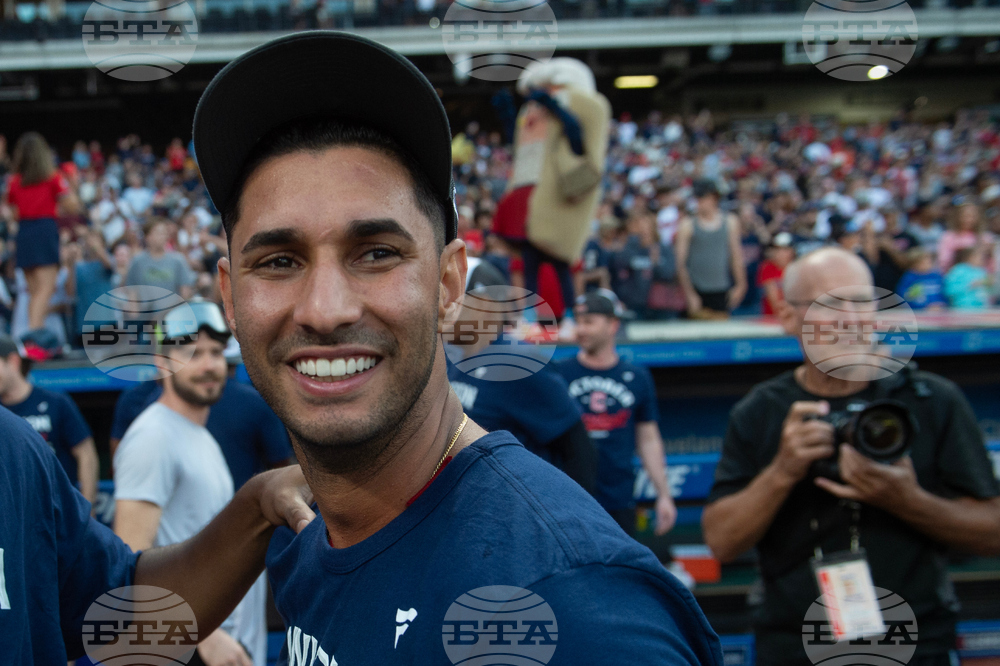 Cleveland Guardians' Brayan Rocchio celebrates winning the American League Central Division Championship, Sunday, Sept. 28, 2025, in Cleveland. (AP Photo/Phil Long)