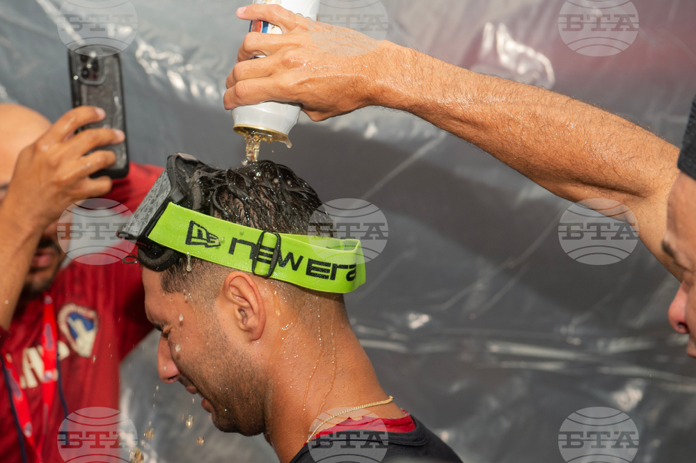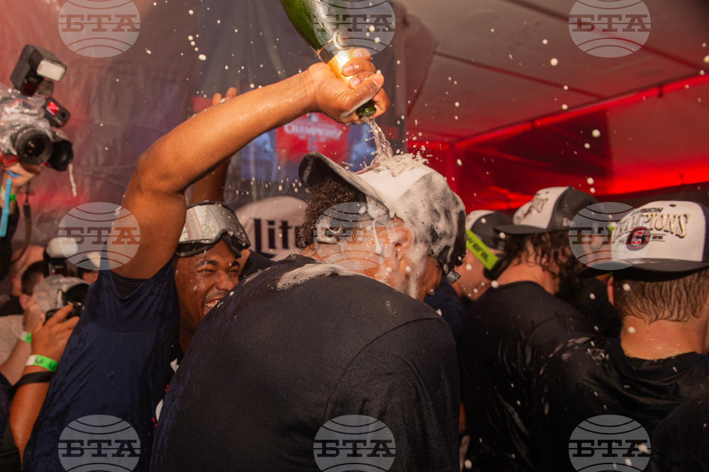 Cleveland Guardians' Angel Martinez, left, douses a teammate after they won the American League Central Division championship in a baseball game against the Texas Rangers, Sunday, Sept. 28, 2025, in Cleveland. (AP Photo/Phil Long)