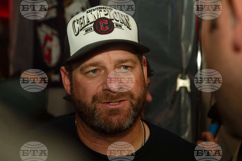 Cleveland Guardians manager Stephen Vogt speaks with reporters during the Guardians celebration of their winning the American League Central Division Championship, Sunday, Sept. 28, 2025, in Cleveland. (AP Photo/Phil Long)